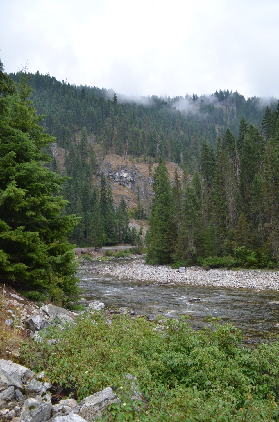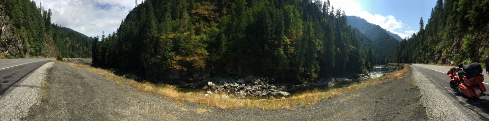 The pass followed along the Clearwater river all the way from the pass down to Lewiston. It was everything that I hoped and more, tight technical sections with a suggested speed of 35 mph into long left and right handed sweepers that almost made you feel like you were completing a 360 turn, this road is spectacular! Down the road something dawned on me so I had to immediately call Leah. I asked her what this area reminded her of and before I could talk she said what I was thinking. This road was very much like the Bella Coola Valley in BC, the river meandering on your left with jagged peaks and and a very narrow valley as you lose elevation. The fog and mist laying overhead added to the feeling.