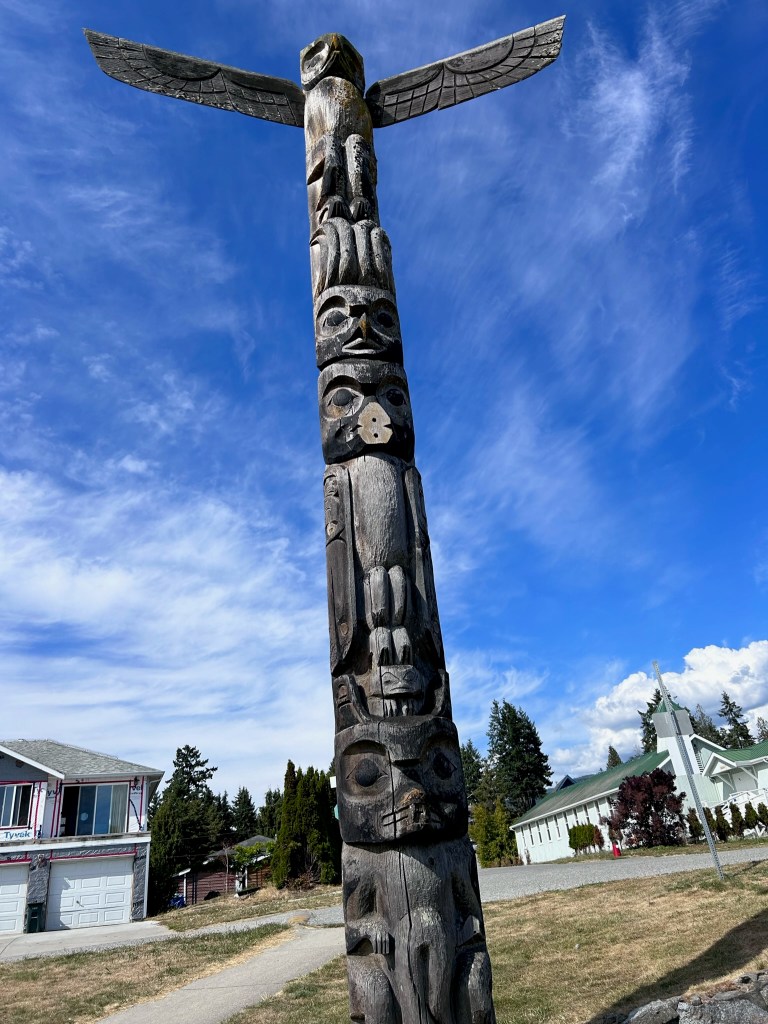 I had noticed that there were some totem poles in town and really wanted to see them up close so we went for a walk from the brewery to the sea wall. I love traditional west coast indigenous carvings and artwork. This is something that I have said to Leah that I would like to support a little more. The five totems on the seawall were erected for each of the clans for self government starting with the one in 1997 and the others in 2008. You can tell each of of the carvers had a different style with some focusing on the individual animal or spirt and the others combining them.