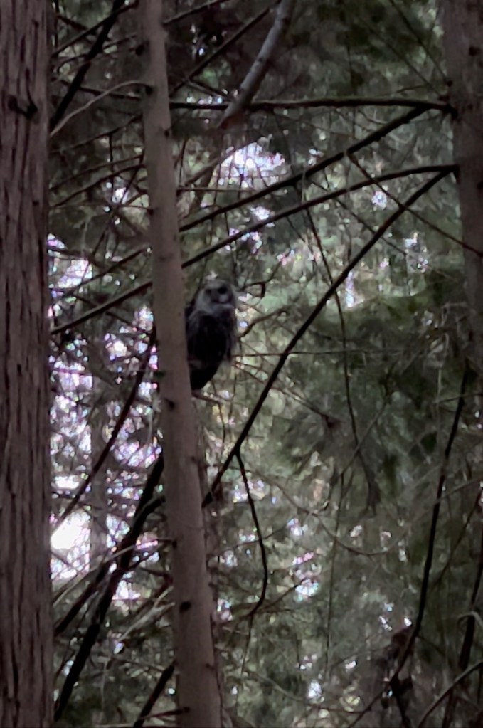 While we were playing golf one of the neighbouring groups called us over as she indicated a younger owl was just across the fence calling every 30 seconds or so. There was also a very pissed off robin squawking and dive bombing the owl.