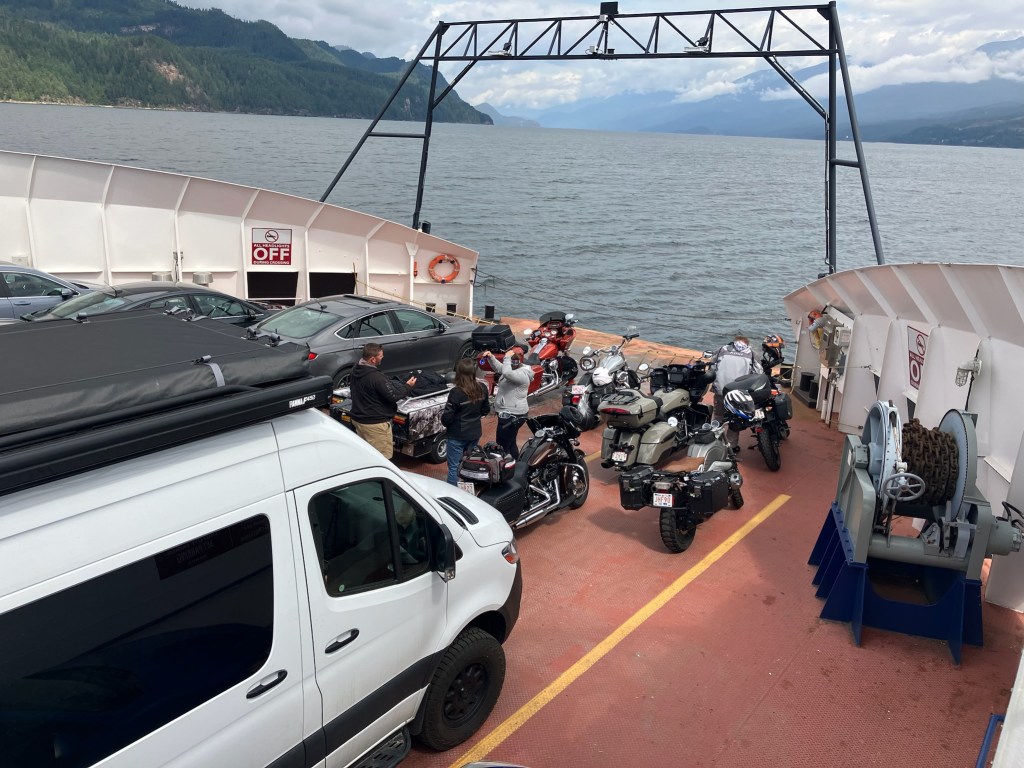 We woke up in the morning and decided to pack up prior to heading to the pavilion for a coffee. We said our goodbyes and left Toad Rock for 2023 not spending as much time there this year. We left around 10:20 hoping to make the 10:40 ferry across the lake but unfortunately did not make it. This gave us more time to have another coffee and a lemon danish from the Balfour bakery right beside the ferry terminal as the next ferry was not set to sail until 11:30. I also have to mention at this time that this was our 7th and final ferry of this journey which is a new record for us.