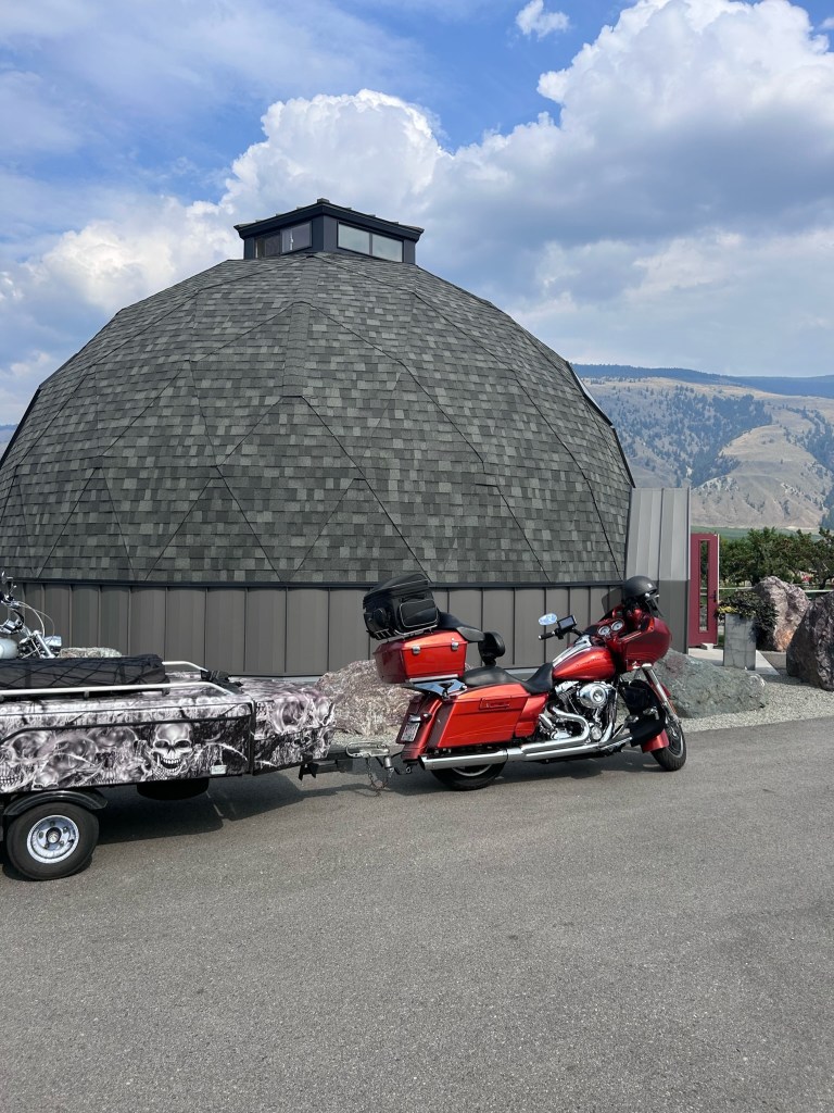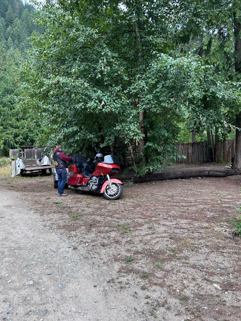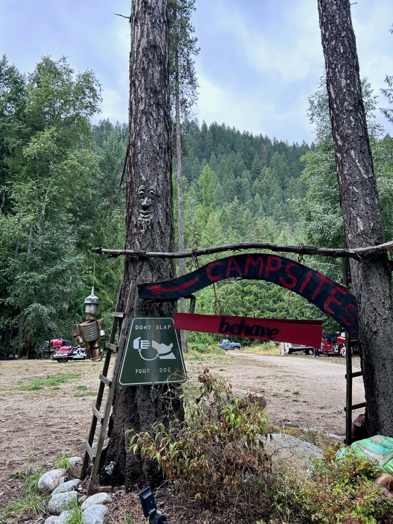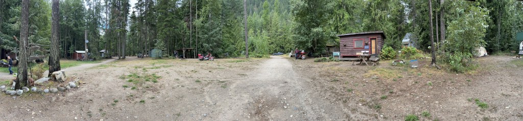 Our final destination for the day was a location that a couple suggested to us when we were at Toad Rock as it seemed to be another motorcycle campground the Horse Thief Hideout just outside of Invermere. We started our way our and quickly encountered gravel outside of Wilmer. As it was getting dark this made the gravel even more “fun”. We pulled into the campground and pulled into what looked like the front of the owners place and knocked on the door. No one answered so we decided as we were losing daylight to just set up camp in the field. This place was spooky as there were RVs set up but no one and I mean no one there at all. We quickly set up and as the bugs were out decided to chill in the trailer until we were ready for bed by having a beer and playing more golf.