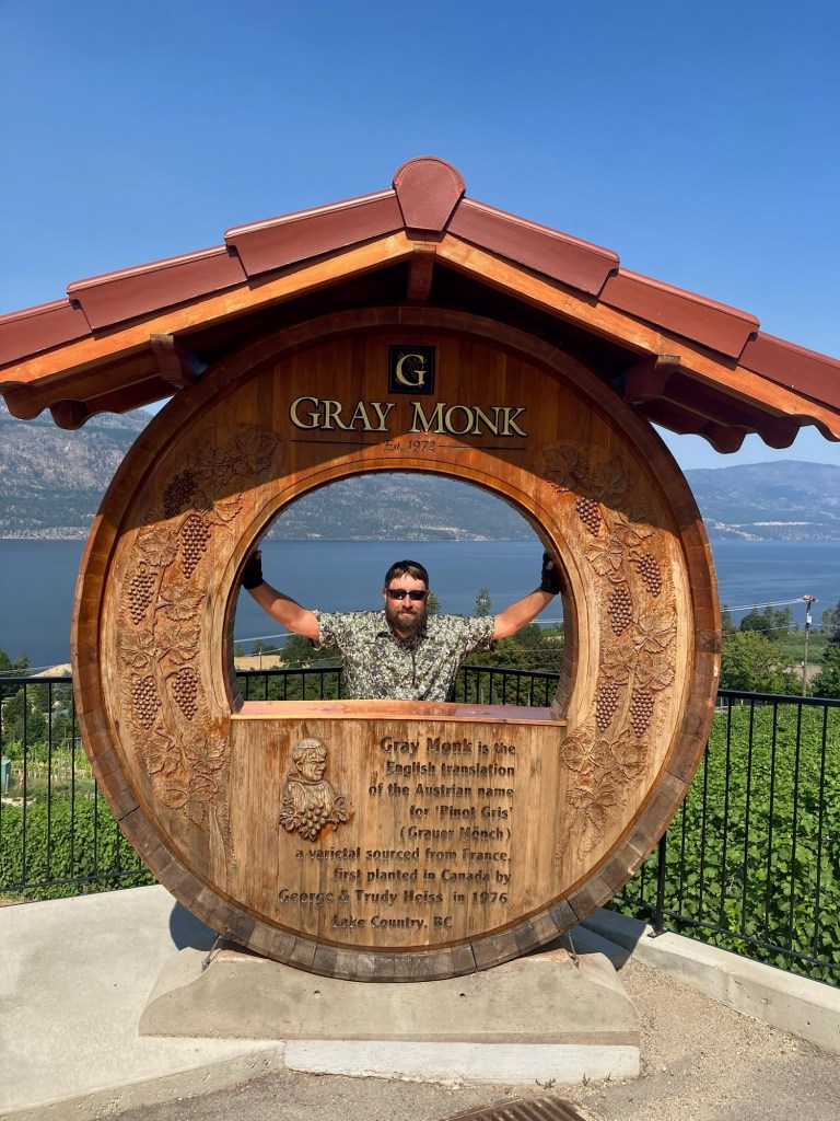 Our first stop was Grey Monk Winery just outside of Lake Country. We arrived and were immediately greeted by Tony, he walked us through the tasting of their Gewurztraminer, Pinot Gris, Rose and Pinot Noir. Now I was going to ask if we can ship a case of the Rose wine back to Alberta as we were on bikes. No sooner than I had that idea in my head he approached us about the Gray Monk wine club, so of course we had to join.
