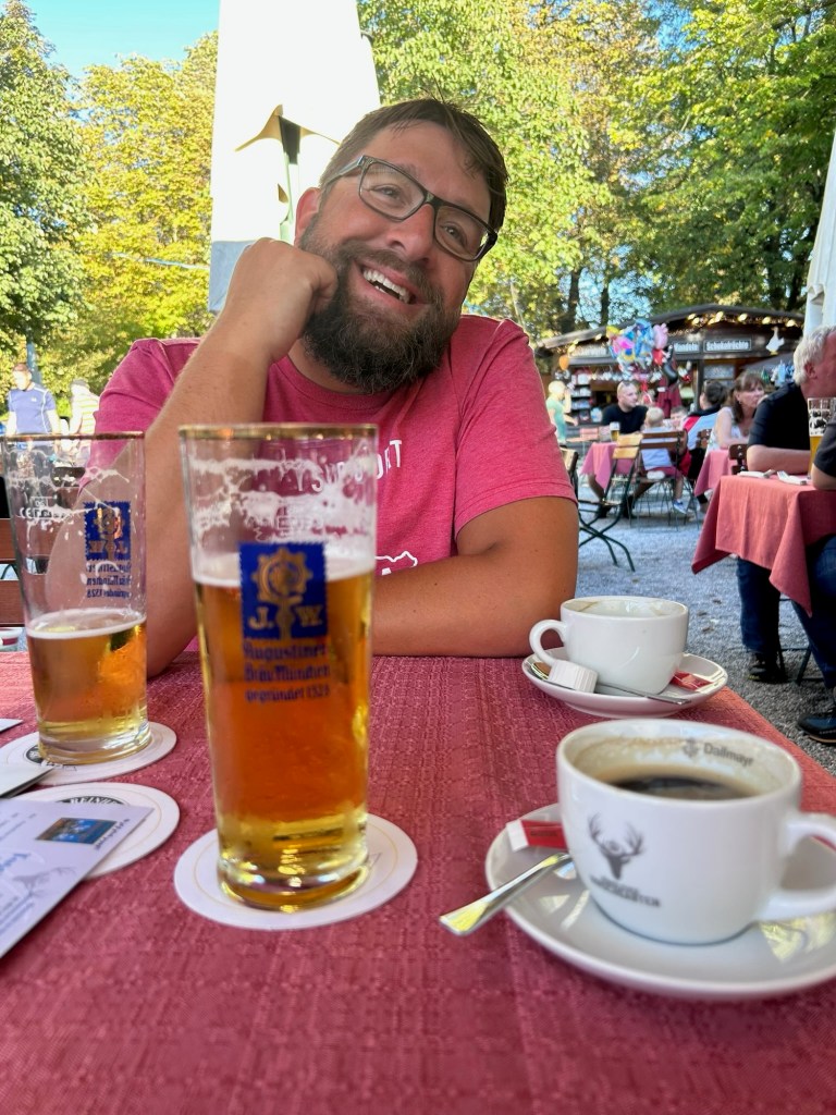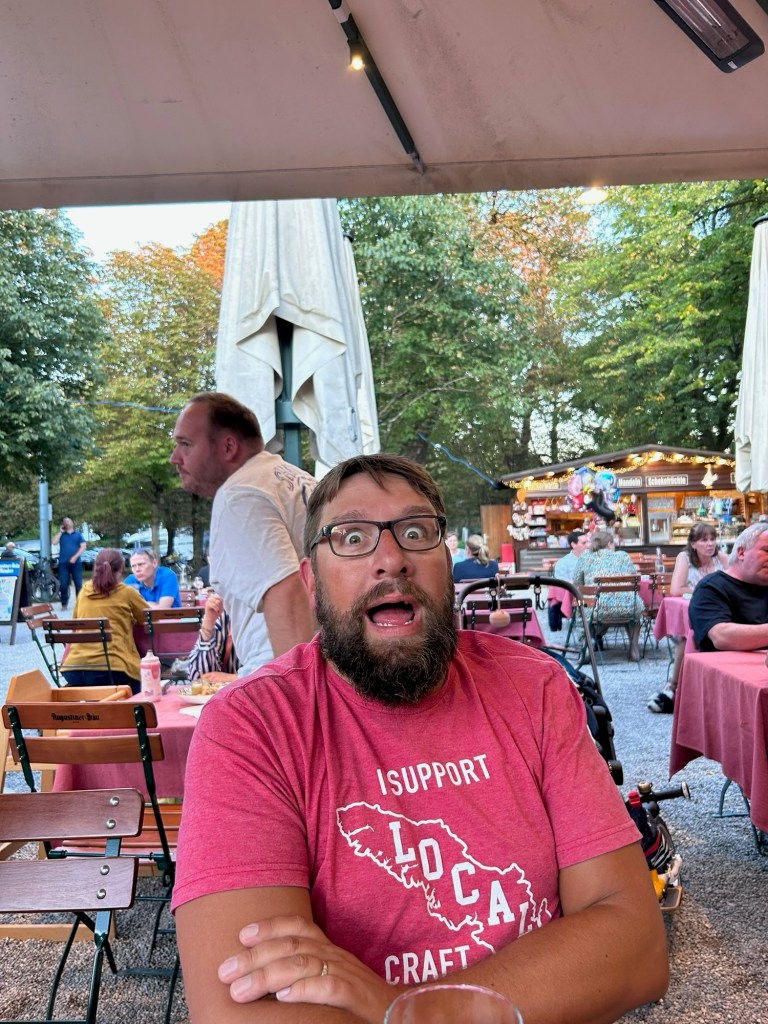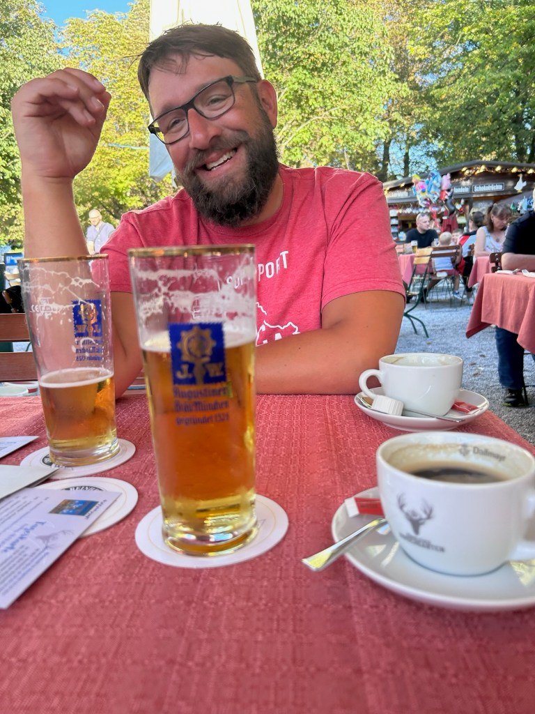 We both had a shower and decided that we need a bite to eat, I happened to stumble onto a bier garden in my searching for a restaurant that was a brief walk from our hotel. We headed out not knowing what to expect as it was attached to a green space. We arrived to the königlicher hirschgarten bier garden. This place was amazing, tons and tons of traditional bier garden tables and benches for large groups where it’s self service. Leah and I elected for the set table area where we would get table service.