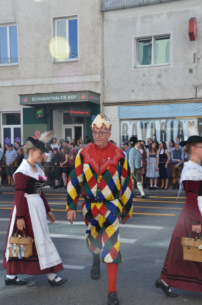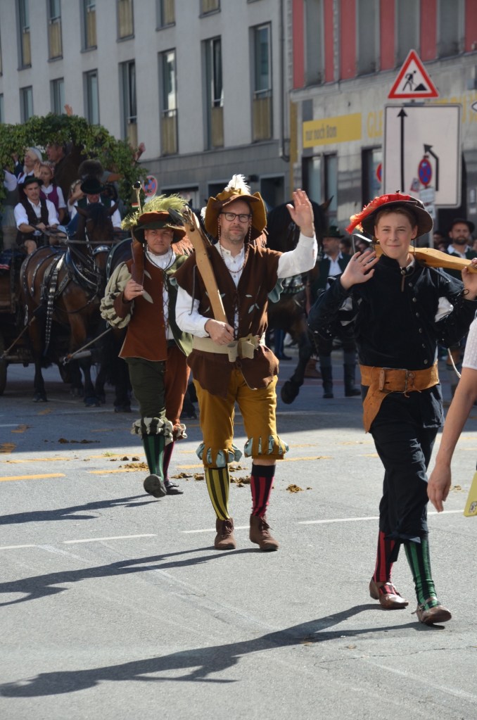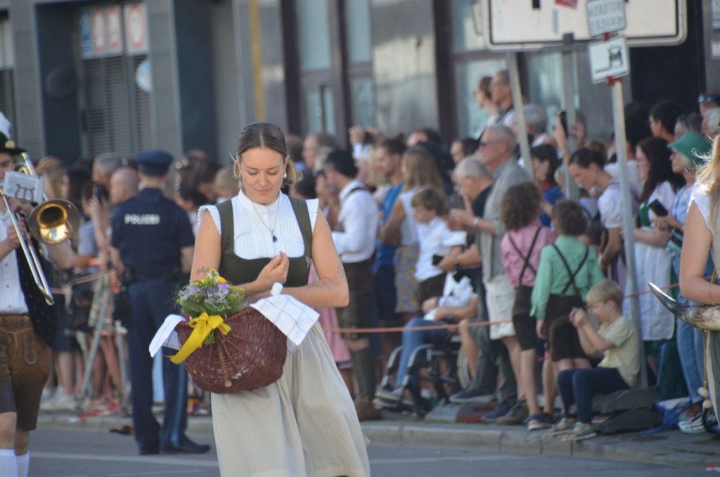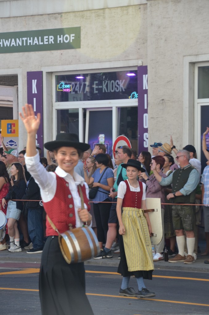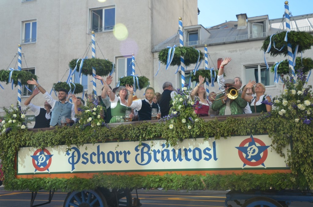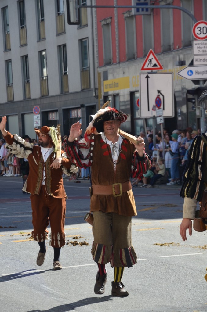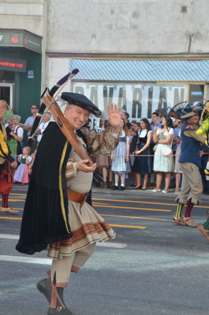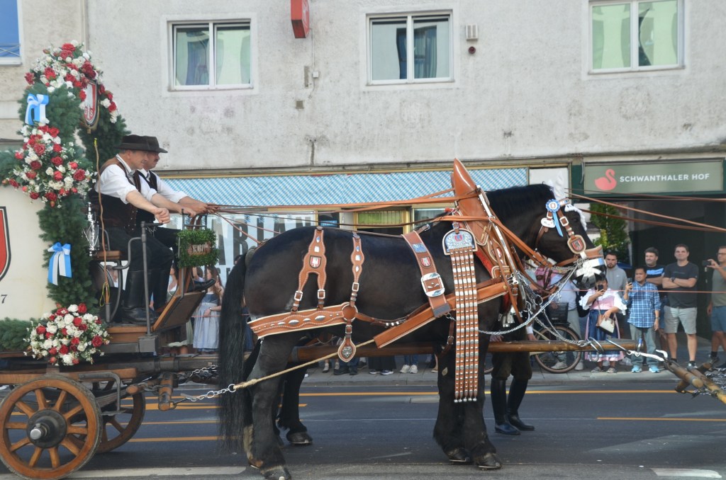 Dressing normally we headed towards the festival grounds and then to the parade route. After finding a place on the route that everyone was avoiding due to the sun exposure we watched an absolutely amazing parade. As Leah was saying the only motorized transport we saw were the fire trucks and the polizei. The number of well behaved draft horses was just amazing. I can’t even count how many floats we watched but it was mind blowing as I think it was over an hour of constant horses and brass bands.