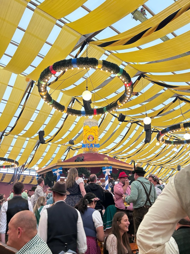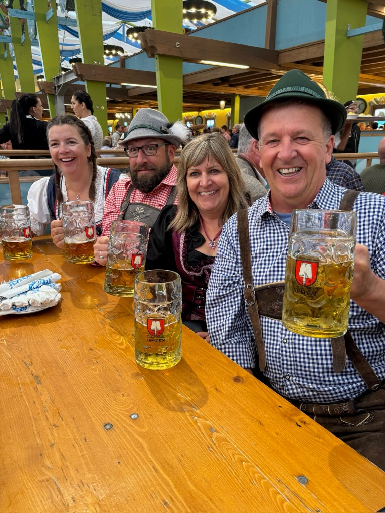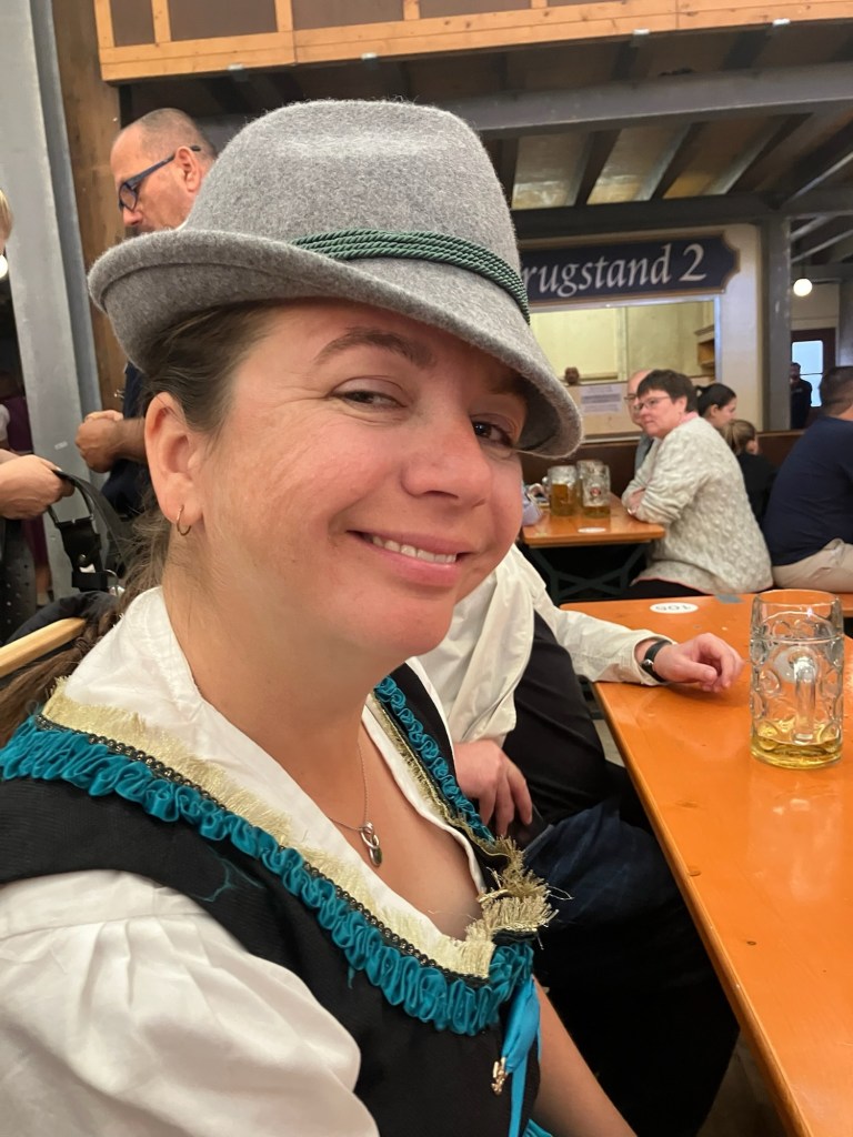 We didn’t have any trouble finding the Thresenweise, we just had to follow everyone dressed for the occasion. I had so idea of the scale but this is something that you need to see in person, this place is huge! We quickly decided on the Paulander Armbrustschutzenzelt tent and found a seat on the back wall. After about a 1/2 hour we were asked by four men from Finland if they could join our table. We were happy to oblige. One from the group, Marcus spoke really good English and as it was not his first time he was able to explain things to us. He really set the tone for the table. He taught us the Ein Prost song and its significance. These guys were a hoot to party with. I was able to purchase myself a traditional felt hat later in the day and the lovely lady selling it even grabbed me a great feather set to go with it.